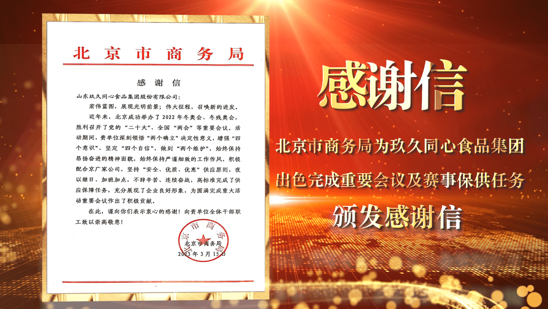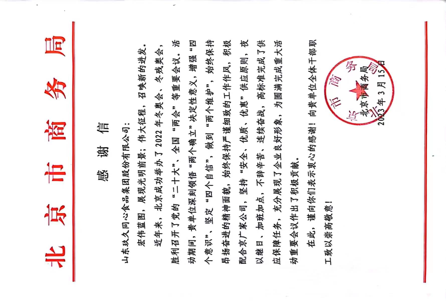 “玖久同心食品集團(tuán)高標(biāo)準(zhǔn)完成了供應(yīng)保障任務(wù),充分展現(xiàn)了企業(yè)良好形象,為圓滿完成重大活動(dòng)重要會(huì)議作出了積極貢獻(xiàn)。在此,謹(jǐn)向你們表示衷心的感謝!向貴單位全體干部職工致以崇高敬意!”北京市商務(wù)局為集團(tuán)頒發(fā)的感謝信寫道。