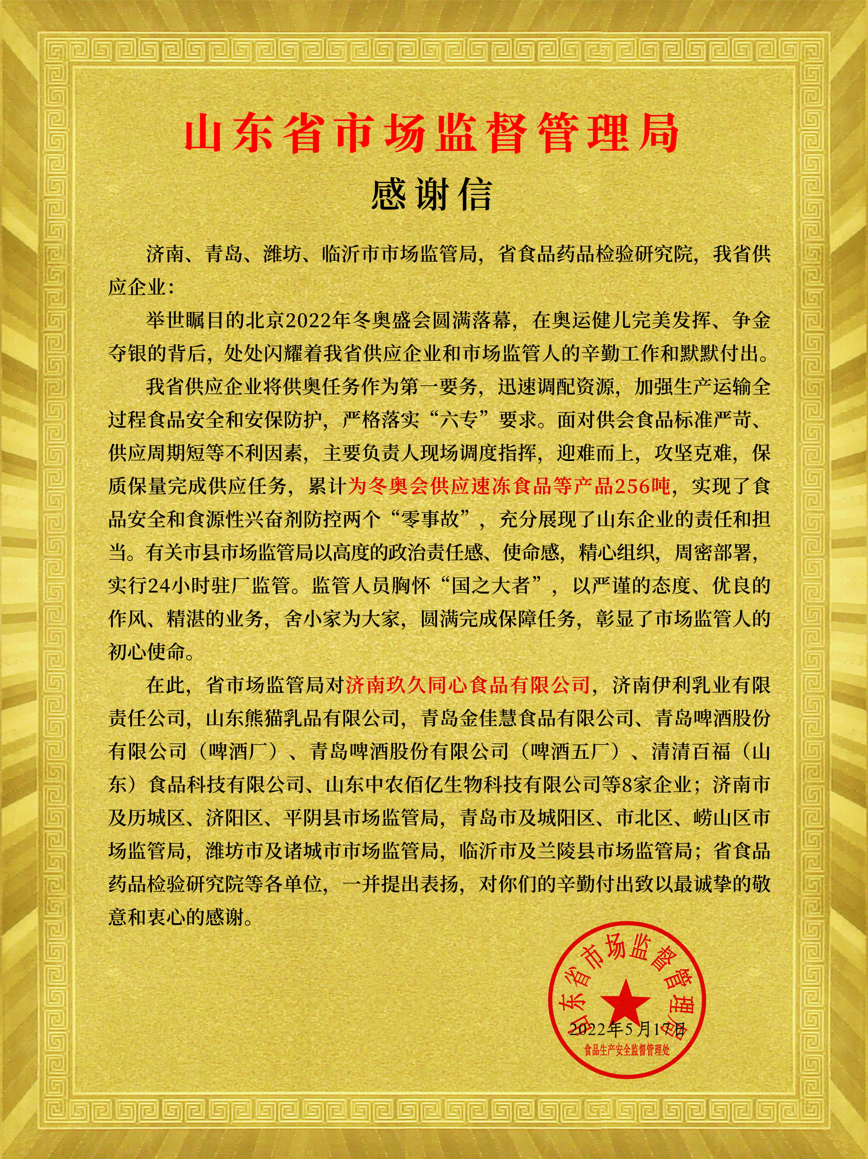 近年來,玖久同心食品集團(tuán)從眾多企業(yè)中脫穎而出,一躍成為2022年北京冬奧會(huì)和冬殘奧會(huì)、黨的二十大及全國(guó)兩會(huì)的保供企業(yè),政府部門頒發(fā)的榮譽(yù)證書接踵而至,北京2022年冬奧會(huì)和冬殘奧會(huì)組織委員會(huì)頒發(fā)的證書、北京市商務(wù)局頒發(fā)的感謝信、山東省市場(chǎng)監(jiān)督管理局頒發(fā)的感謝信、濟(jì)南市市場(chǎng)監(jiān)督管理局頒發(fā)的證明......